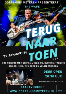 Na de geslaagde “Terug naar Toen” avond kregen wij van velen het verzoek om wederom een avond met heerlijke muziek te organiseren. Uiteraard geven wij daar gehoor aan. Dit keer met de, bij vele inmiddels bekende band, The Wave. Zij spelen heerlijke 80s en zullen nummers van The Simple Minds, U2, INXS, Blondie, Talking Heads, The Cure en velen anderen laten horen. Wij hopen dat jullie er allen weer bij zijn. Let op ! Vorig jaar waren we volledig uitverkocht. Dus koop je kaarten op tijd. Kaarten via deze link
