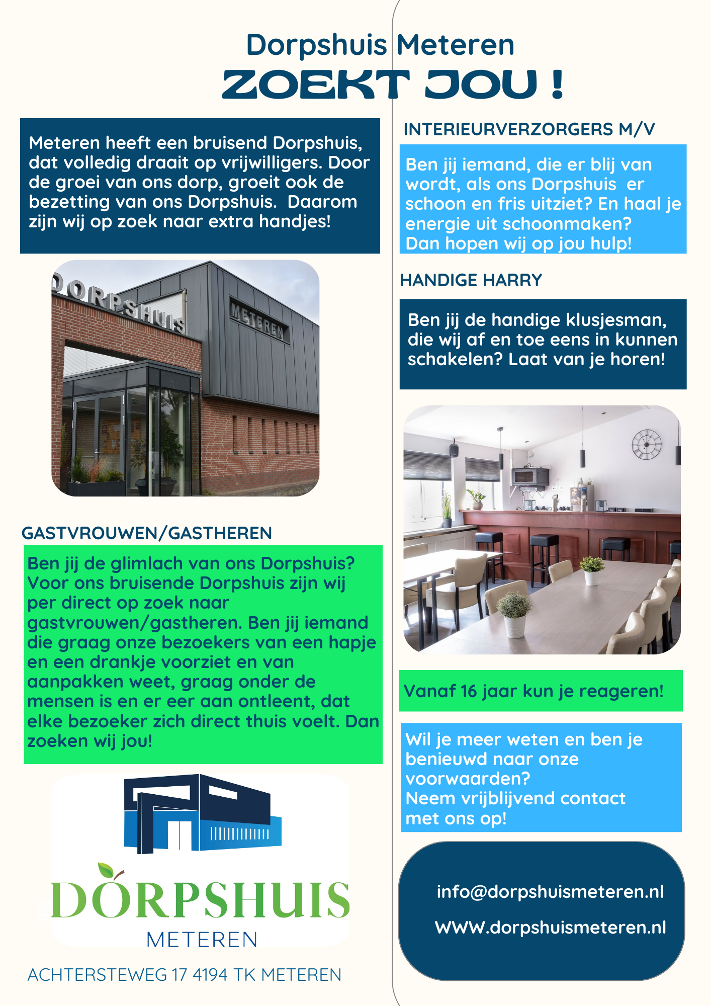 Lijkt het jou leuk ?  Stuur dan een berichtje naar info@dorpshuismeteren.nl We komen graag met jou in gesprek!